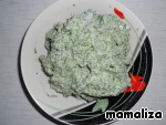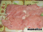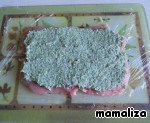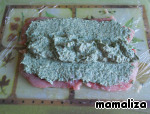 Отбитое филе немного солим, перчим и смазываем слоем начинки примерно 0,5 см толщиной.