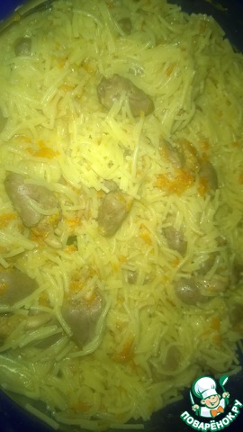 3. Добавить к сердечкам натертую на мелкой терке морковь и макароны. Если необходимо, добавить водички, чтобы макароны были полностью покрыты водой. Добавить сметанки, выдавить чесночек, посолить, поперчить. Оставить тушиться на медленном огне до готовности.