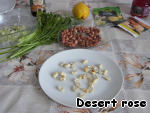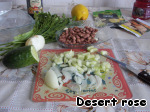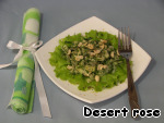 Смешать твердые ингредиенты, выложить в салатник, полить соусом, посыпать лимонным перцем, зеленью, слегка обжаренным кунжутом. Лимонный перец можно заменить черным молотым с добавлением тертой лимонной цедры.