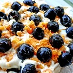 6. Желтки протереть на мелкой терке. Майонезом нарисовать сетку по желткам. В каждую ячейку сетки положить четвертинку маслины. По краю салата выложить чипсы как лепестки.