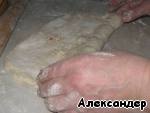 Одну часть вернуть в миску и накрыть пленкой, вторую расплющить на рабочей поверхности, припыленной мукой в прямоугольник размером прибл. 40 Х 40 см.