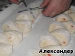 Теперь будем надрезать хлеб. Для этого понадобятся большие ножницы - с их помощью будем надрезать тесто сверху и почти донизу, но не до конца, под углом 45 градусов, на расстоянии 4-5 см.
