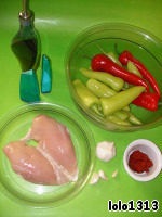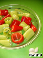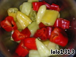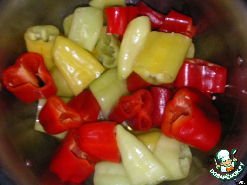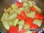 ... обжарить слегка чеснок, добавить нарезанные перцы.