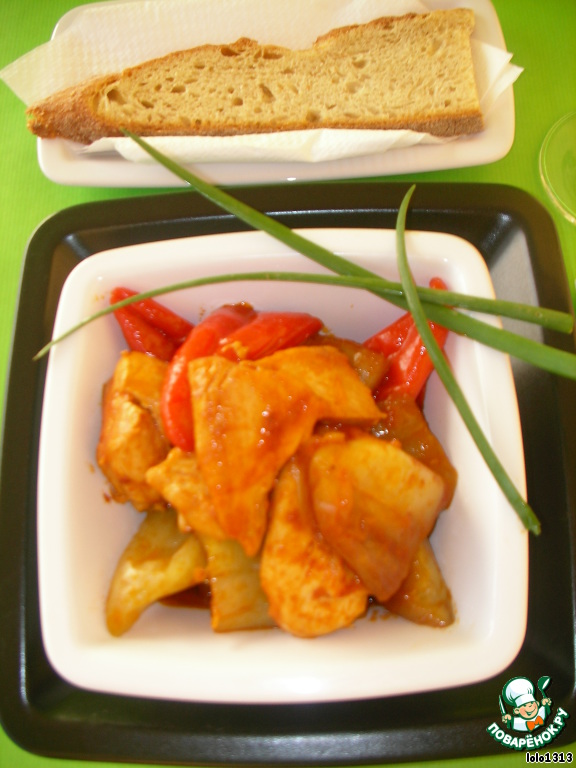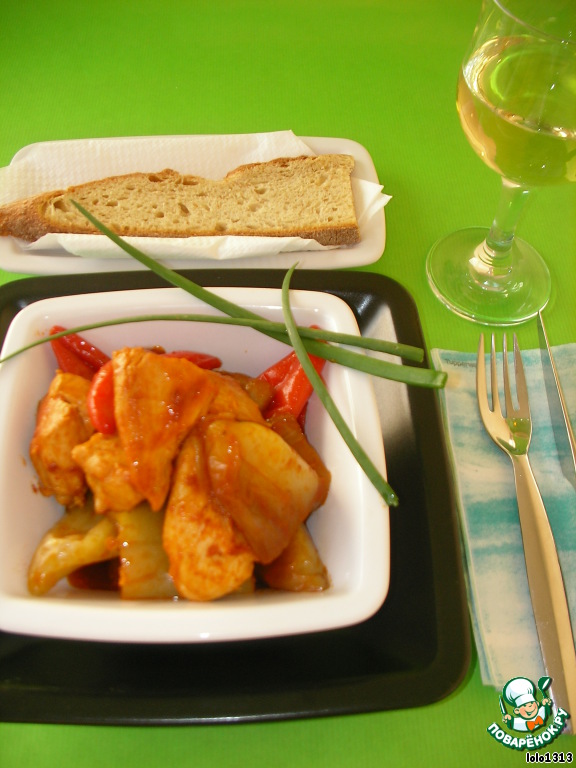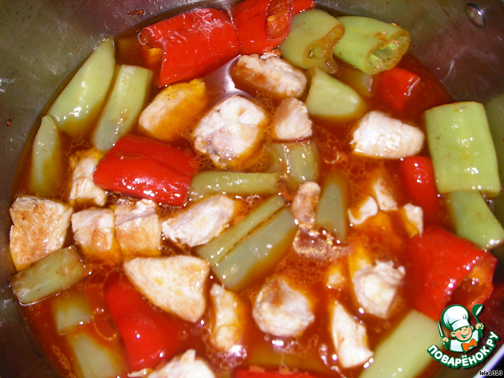 Добавить опять обжаренные кусочки куриного мяса, ложку томатной пасты( можно и побольше, это на любителя), посолить, поперчить, залить водой (вином) и довести до готовности (до полного испарения жидкости). -