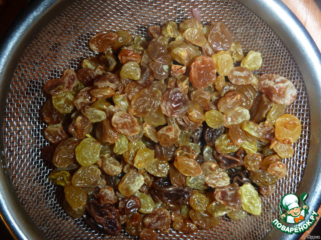 Изюм очистить от веточек. Тщательно промыть в теплой воде.
