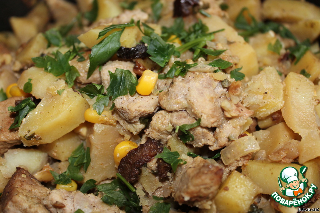 Это жаркое я приготовила вчера на ужин, получилось очень вкусно: сочные ломтики телятины, нежная картошечка, кусочки чернослива и грецкие орехи делают блюдо удивительно ароматным, а незаменимые грузинские специи и зелень петрушки придают жаркому некую пикантность.
