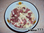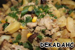 Добавить картофель, порезанный ломтиками, кусочки чернослива и порубленные орехи.
