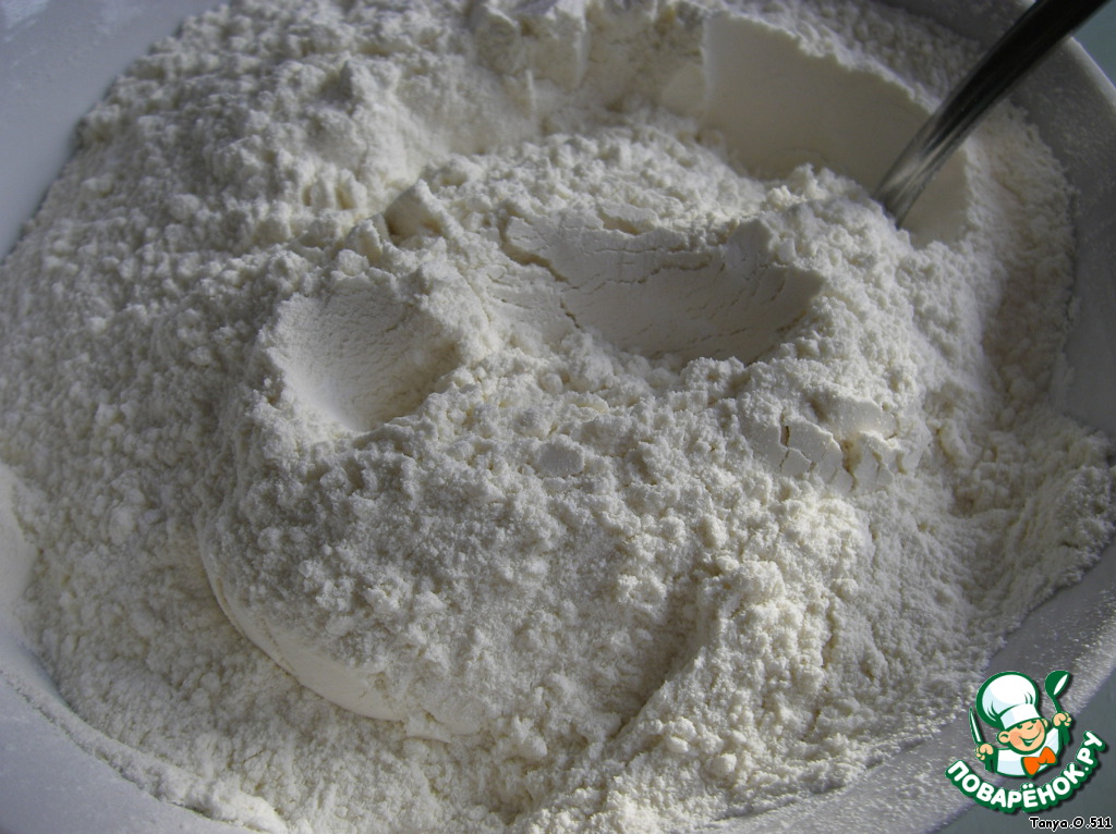 Муку просеять, добавить разрыхлитель, хорошо перемешать.