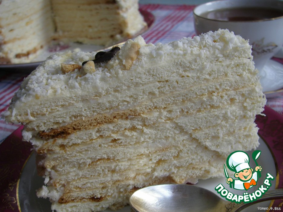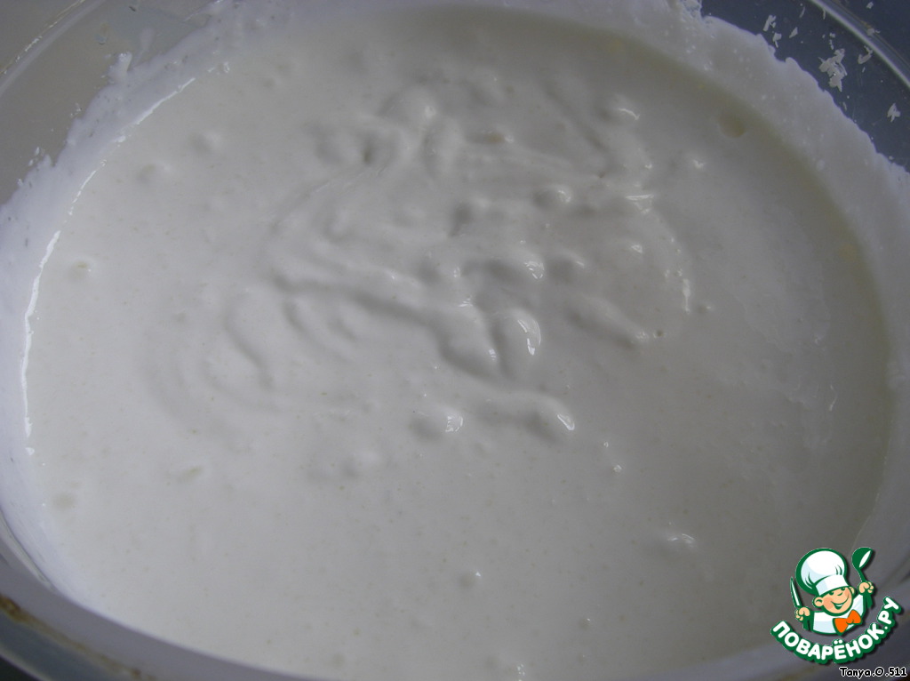 Сделать крем: в сметану добавить 1,5 ст. сахара, ванильный сахар, кокосовую стружку (немного оставить для посыпки) и взбить хорошо миксером.