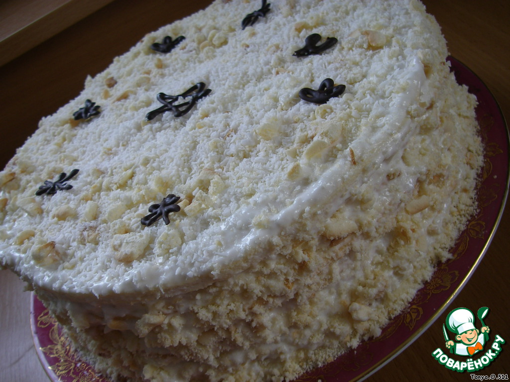 Верх и бока торта посыпать крошкой из остатков коржей и кокосовой стружкой. Убрать на ночь в холодильник для пропитки.