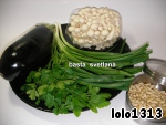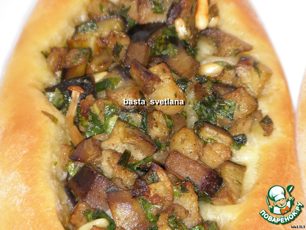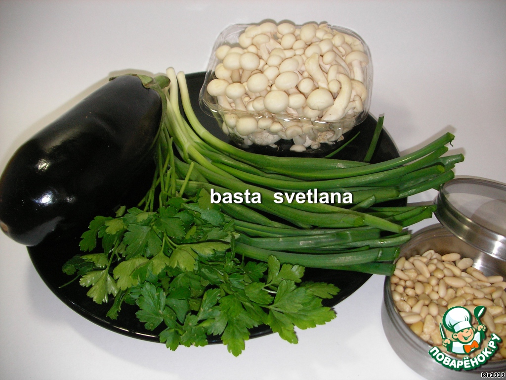 Для лепёшек среднего размера нашими исходными данными являются: грибы свежие, баклажан, зелень петрушки, зелёный лук, кедровые орешки, соль, перец, оливковое масло.