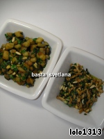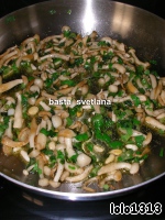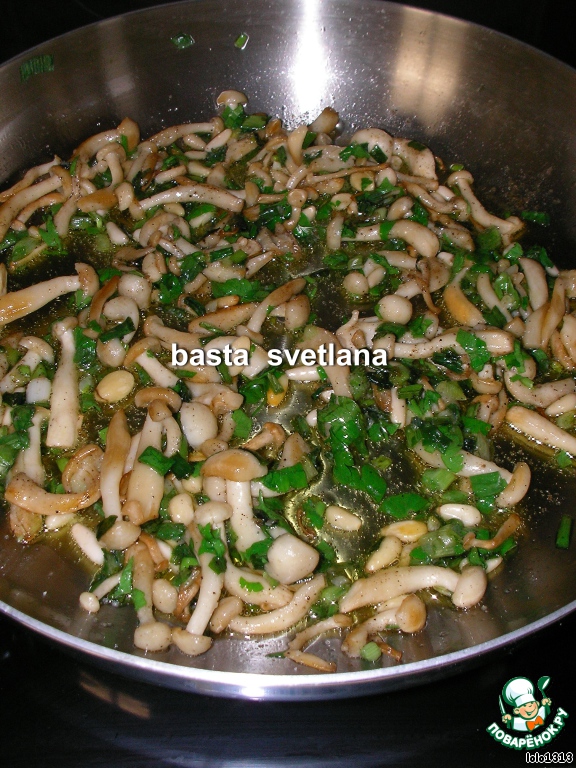 ...затем добавить мелко порезанный зелёный лук, через некоторое время добавить кедровые орешки и в последнюю очередь зелень петрушки.