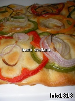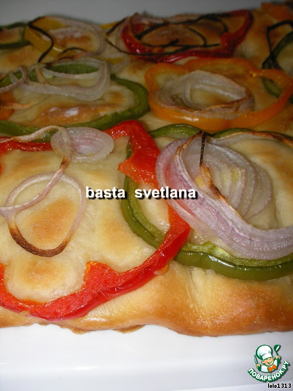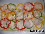 На поверхности затем разложить порезанные на кольца болгарский перец и репчатый лук.
