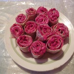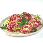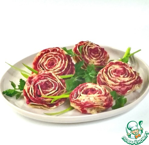 А можно приготовить так. Наверх салатика выкладываем розы и украшаем огурцом. Но лучше, конечно, готовить, как самостоятельную закуску.