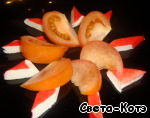 Режем крабовые палочки наискосок, а помидоры дольками. Укладываем друг за другом по кругу.
