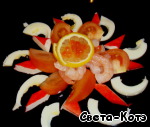 В центр укладываем креветки (по 10 шт. на 1 порцию). Из дольки лимона сооружаем «чашечку» для икры. А в нее и саму икорочку!