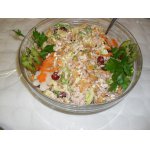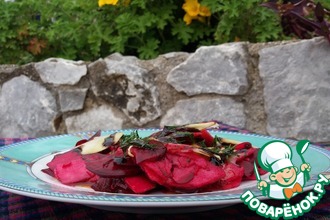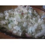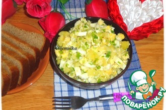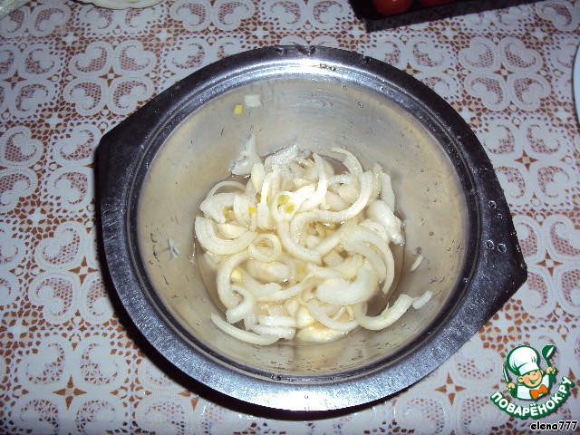Да, забыла написать - перед началом приготовления салата, замаринуйте лук на 15-20 минут, порезанный полукольцами, вот в таком маринаде: развести в холодной кипячёной воде яблочный уксус, по щепотке соли и сахара, залить лук.