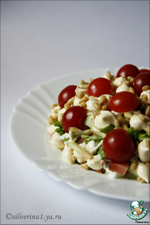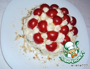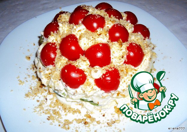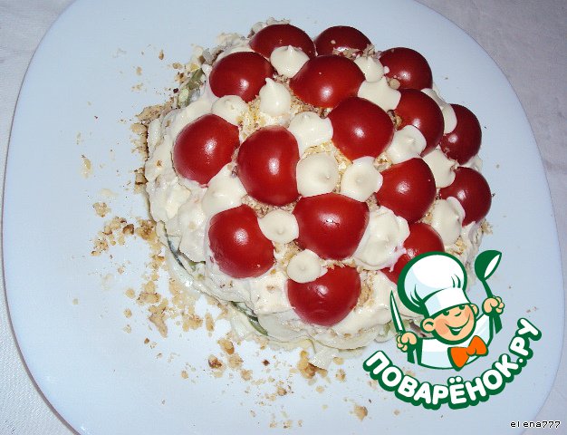 Украсить половинками черри и капельками майонеза.