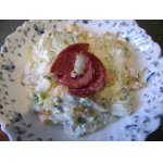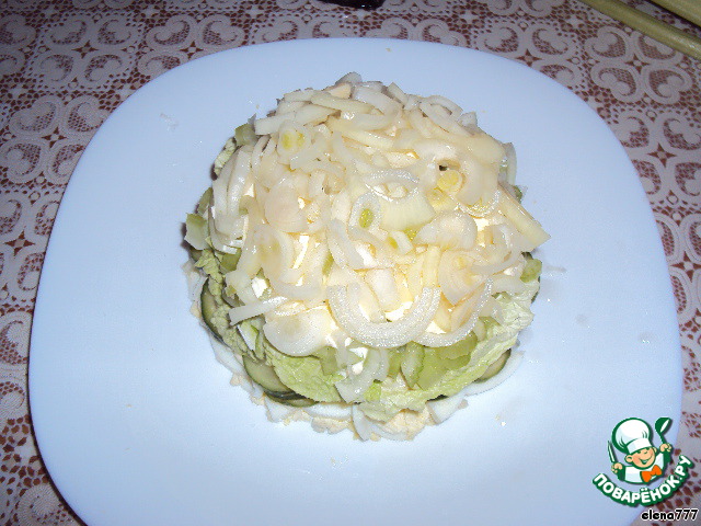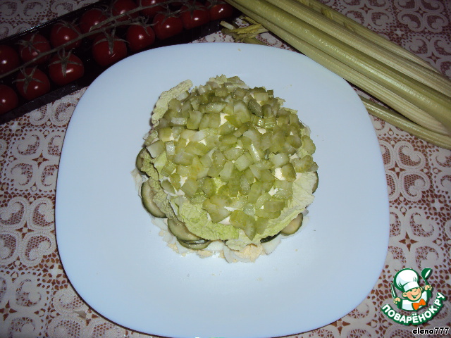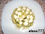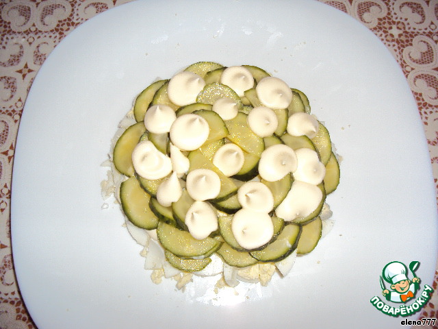 Огурцы, порезанные полукольцами, снова немного майонеза.