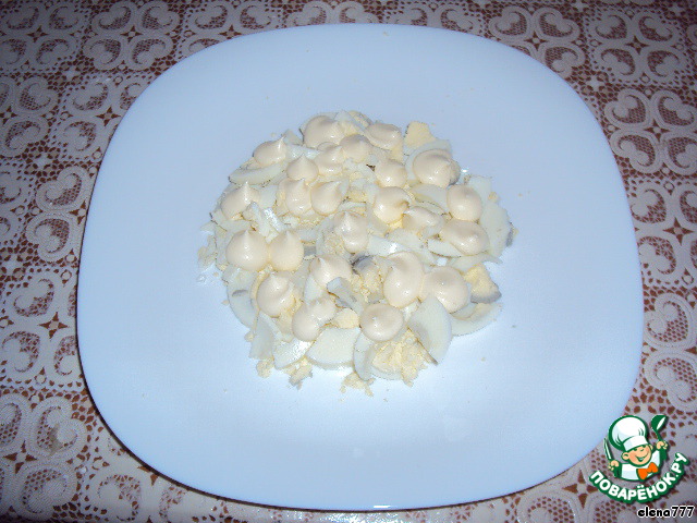 На плоское блюдо выкладывать слоями - отварные порезанные яйца, промазать майонезом.
