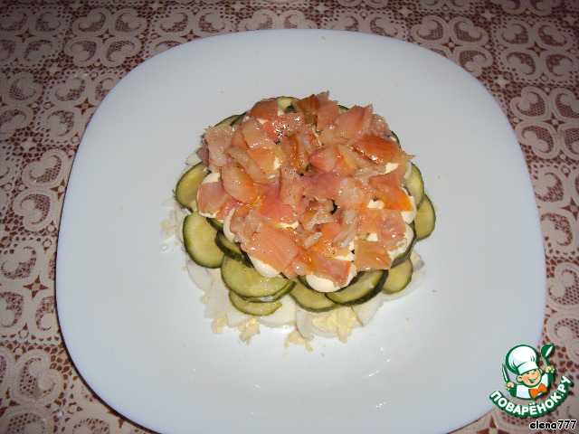 На огурцы выложить слой мелкопорезанной сёмги.