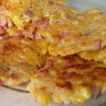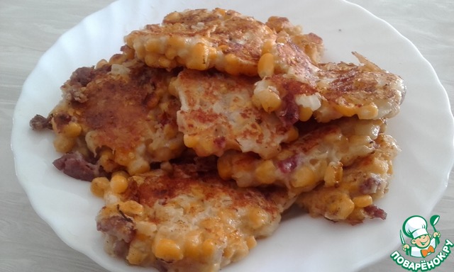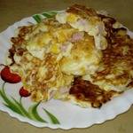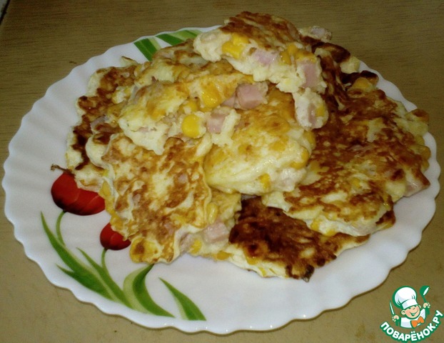 Добавить в эту смесь кукурузу, 4 ст. л. кукурузного сока, мелко нарезанную ветчину, тертый на крупной терке сыр и хорошо все перемешать.