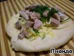 На лепешку выложить начинку: натертый сыр, мелко порезаное вареное мясо, зелень.