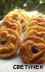 Маленькие лепешки положить на большие, сверху - изюминку, надавить на нее пальцем.