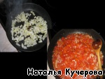 • Обжарить лук и чеснок на оливковом масле на небольшом огне. Добавить помидоры и перец, посолить, поперчить и готовить вместе на небольшом огне где-то 10 минут.