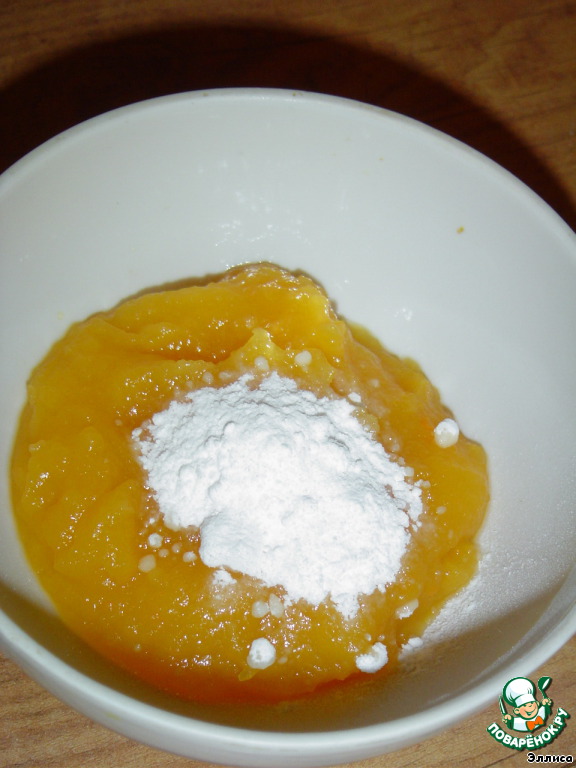 Тыкву нарезаем кусками и запекаем в духовке, затем блендером превращаем ее в однородную массу. К пюре добавляем сахар (у меня пудра) и перемешиваем.