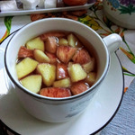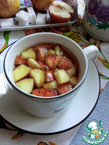 Завариваем зеленый чай, наполняем им чашки с яблоками, накрываем блюдцами и даем настояться пару минут.
