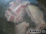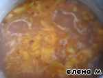 Дать покипеть на медленном огне пару минут, добавить нарезанное мясо, сосиски, лавровый лист и черный перец. Варить 5 минут, затем снять с огня, крышкой не накрывать.