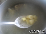 В кипящий бульон добавить соль и нарезанный картофель, варить 10 минут.