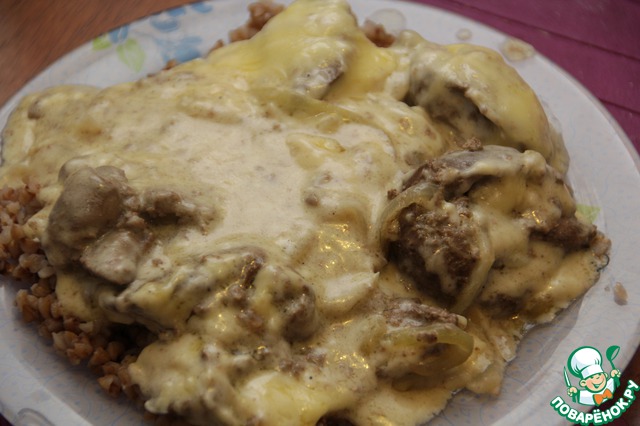 Сметану развести с 2 ст.л. воды, поставить на огонь, посолить, поперчить, добавить муку и прогреть. Печень разложить по горшочкам, залить сметанным соусом, посыпать натёртым сыром.