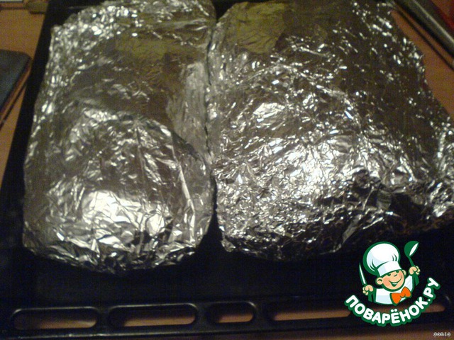 После маринования достаем мясо (шейку, окорок), даем минут 20, чтобы водичка лишняя стекла. После этого шпигуем мясо морковкой и чесночком, побольше и поглубже. После этой процедуры заматываем мясо в фольгу (пеленаем любовно и тщательно) и ставим в духовку. Температура около 200 гр. на долгие 4 -5 часов. Мясо полумлеет, полуварится в выделившемся соке и жидкости. За полчаса до готовности раскрываем фольгу, врубаем духовку на полную мощность (включаем мощную вентиляцию, возможен дым и чад), с той целью, чтобы мясо подрумянилось и жидкость лишняя выпарилась (не переусердствуйте - обугленный кусок свинины это вовсе не мясо "По-юбилейному). Приятного аппетита!