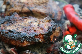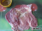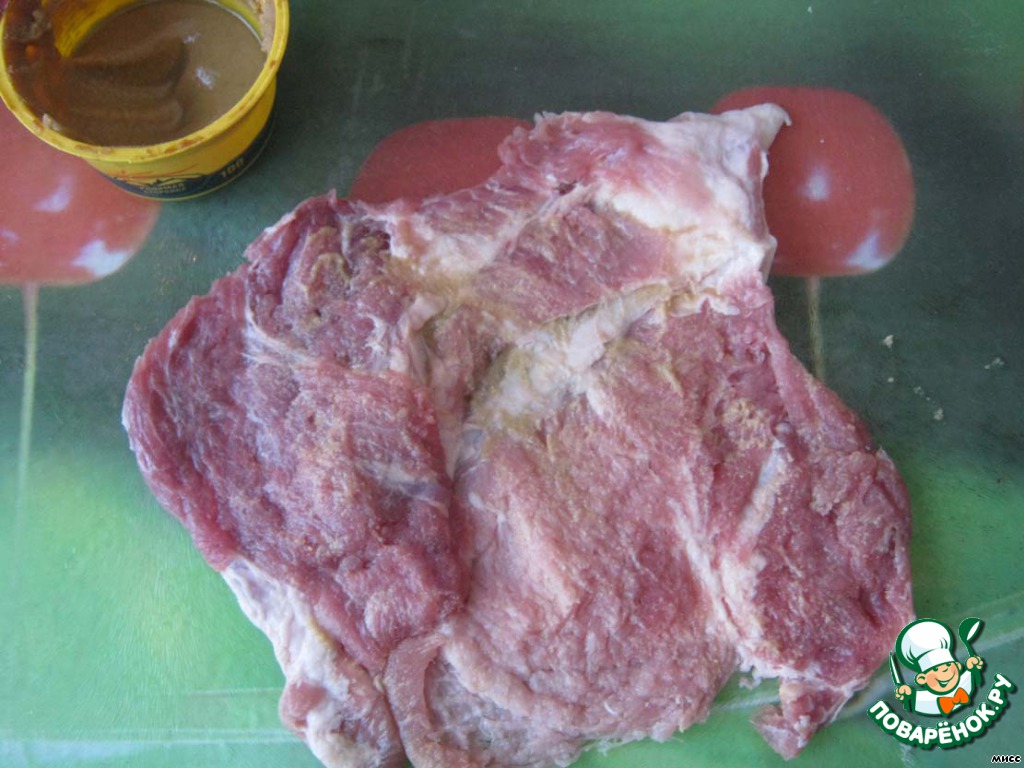 Мясо солим, перчим и намазываем с одной стороны горчицей. Можете добавить любые приправы, типа "аджика", "хмели-сунели". Оставляем мариноваться.