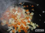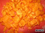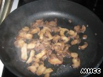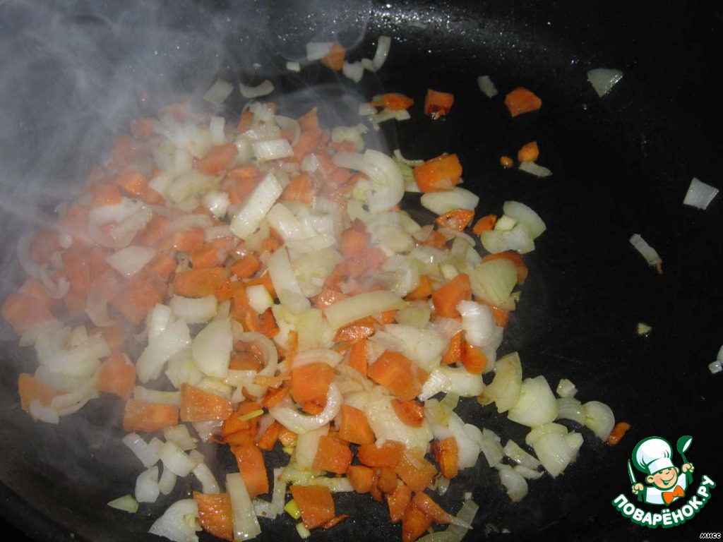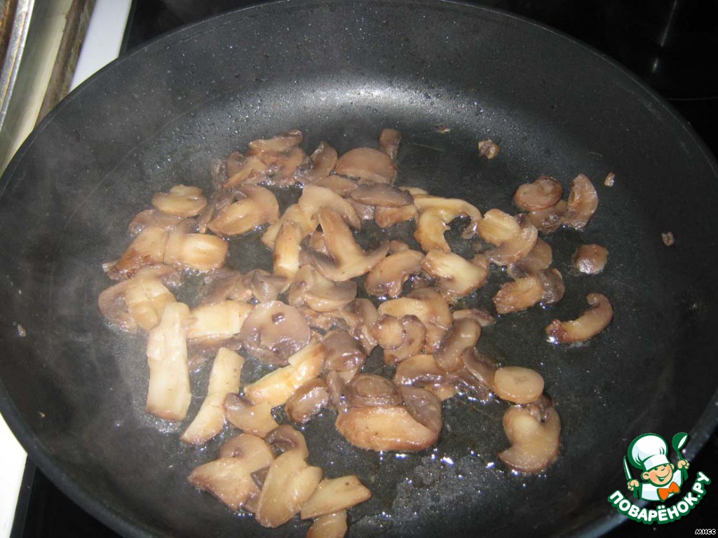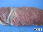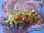 На сторону мяса, обмазанную горчицей, кладём по чайной ложке грибов, моркови с луком и консервированной кукурузы.