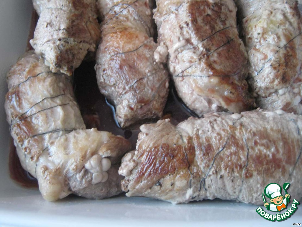 Укладываем рулетики в огнеупорную форму. Заливаем на половину вином.