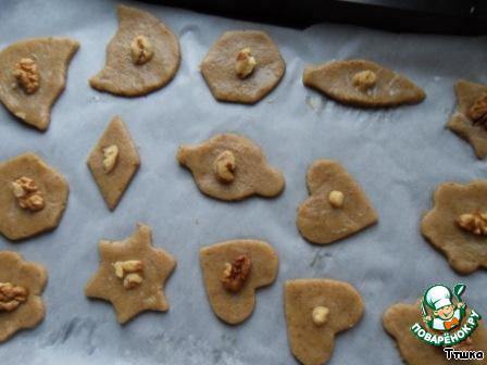 Вырезаем фигурки, выкладываем их на пергамент. На каждую фигурку кладем кусочек грецкого ореха, предварительно смазав тесто желтком, разболтанным с водой.