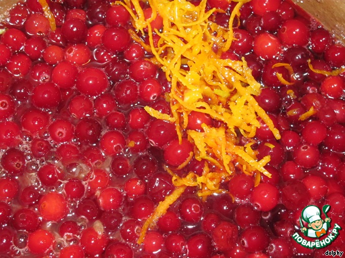Добавьте клюкву, апельсиновый сок и цедру. Снимите с огня и дайте немного остыть.