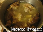 Ножки сварить в скороварке с лавровым листом, перцем и 1 луковицей, разрезанной пополам. Варить в позиции 2, 20 минут после начала выхода пара.