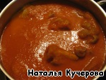 Добавить 3 половника бульона (от варки ножек). Все хорошо растереть блендером до состояния соуса. Ножки положить в кастрюльку, залить соусом и прокипятить 1-2 минуты.