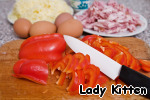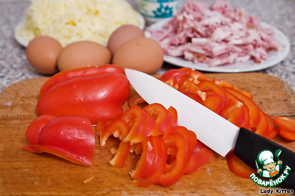 Бекон, ветчину и перец нарезать соломкой. Сыр натереть на терке.