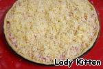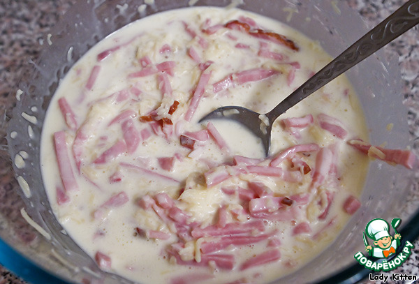 В заливку добавить бекон, ветчину и половину сыра.