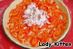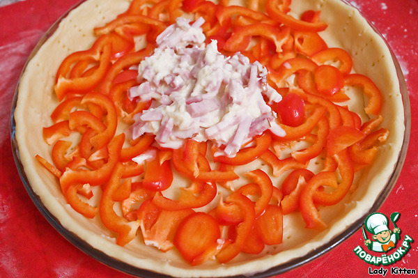 В форму для запекания выложить тесто. На дно уложить слой перца, сверху выложить заливку.