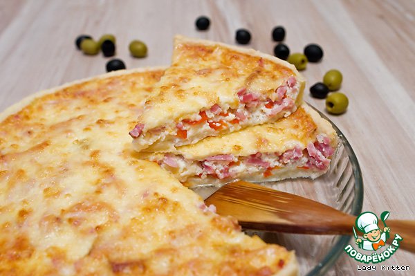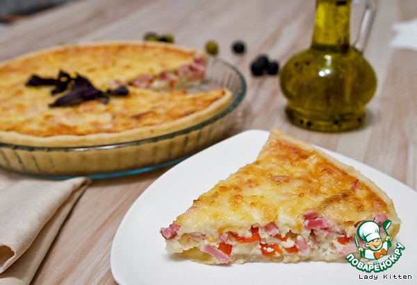 Сочный вкусный пирог из песочного теста с начинкой из бекона, ветчины и сладкого перца. Рецепт этого блюда был размещен на сайте в 2008 году пользователем volga1201 под названием «Сырный пирог с беконом и перцем» и иллюстрирован мной в рамках акции «Раскраски».