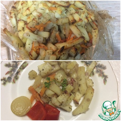 Упаковываем все в рукав для запекания, ставим в духовку, засекаем времечко и... свободны! Килограмм картошки у меня при температуре 180 градусов запекается ровно полтора часа. Духовки, конечно, у всех разные и со временем приготовления каждая хозяйка должна определиться сама, для этого достаточно один раз приготовить и будете точно знать сколько времени Вам потребуется. Когда будете готовить в первый раз, ни в коем случае не уходить «с собакой гулять» :). В первый раз, как в первый класс - надо все контролировать. Мало ли... Потом, когда готовка пойдет на "автомате", то можно хоть на маникюр идти.