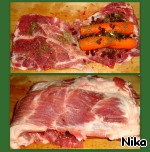 Свинину разрезать на две части вдоль, но не до самого конца. Отбить с внутренней стороны. Посыпать приправой для мяса, сухой приправой, перцем чёрным молотым и чесночной солью. Положить морковь и один лавровый лист. Морковь желательно немного поварить, тогда время на приготовление мяса сократится, т. е вместо 60 минут достаточно будет 40 - ка.