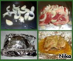 Разложить лист фольги. На неё немного репчатого лука. На лук положить мясо. Сверху на мясо выложить остатки лука. Фольгу с трёх сторон закрутить вовнутрь. Поставить мясо в горячую духовку на 60 минут при темперетуре 180 - 200 градусов... Мясо приготовилось. Несмотря на то, что мясо было сухим, оно дало много сока.