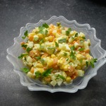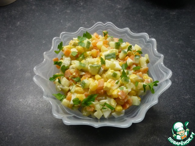 Обычный "Оливье" мои девчонки уже не едят, но вот этот салатик уплетают за обе щеки, хотя салат без колбасы и без мяса, но с интересной заправкой.